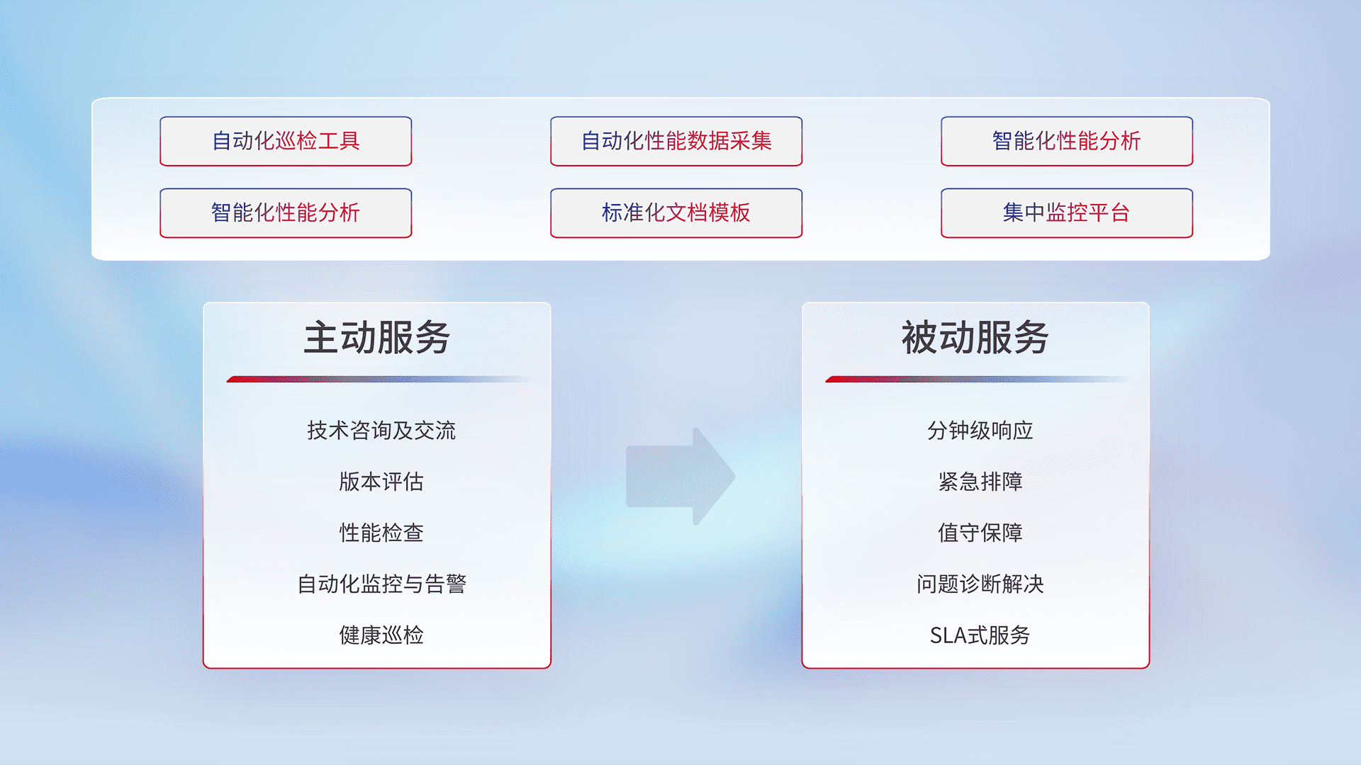智能化工具和标准化文档,,,,保障服务质量,,,提供主动服务(包含技术咨询、、、、版本评估、、性能检查、、、自动化监控与告警、、、、健康巡检)和被动服务包含(分钟级响应、、、紧急排障、、值守保障、、、、问题诊断解决、、SLA服务)。。